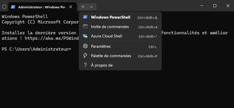 L’application « Windows Terminal », disponible par défaut sur Windows 11, est aussi intégrée par défaut à Windows Server 2025. Cette application permet d’ouvrir plusieurs consoles (Invite de commandes, PowerShell, Azure Cloud Shell, etc…) dans une même interface.