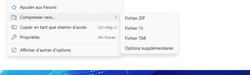 Un nouvel assistant pour compresser les fichiers dans des archives a été introduit, au même titre que dans Windows 11 24H2. Il permet de créer des archives dans plusieurs formats sans utiliser un logiciel tiers : ZIP, 7z et TAR.