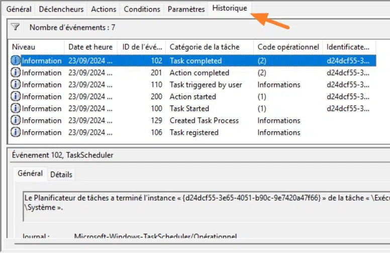 Tout d’abord, sachez que lorsqu’une tâche planifiée est sélectionnée, l’onglet « Historique » de la console « Planificateur de tâches » vous donnera des précisions sur l’activité de cette tâche. C’est une façon de trouver une explication au dysfonctionnement rencontré.