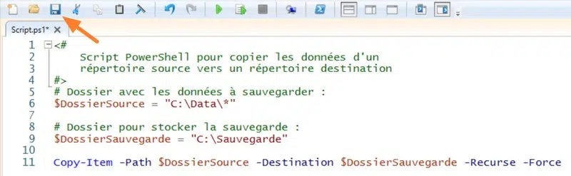 Ensuite, cliquez sur le bouton représentant une disquette afin d’enregistrer le fichier. Enregistrez le fichier sous « C:\Data » en utilisant le nom « Script.ps1 ».