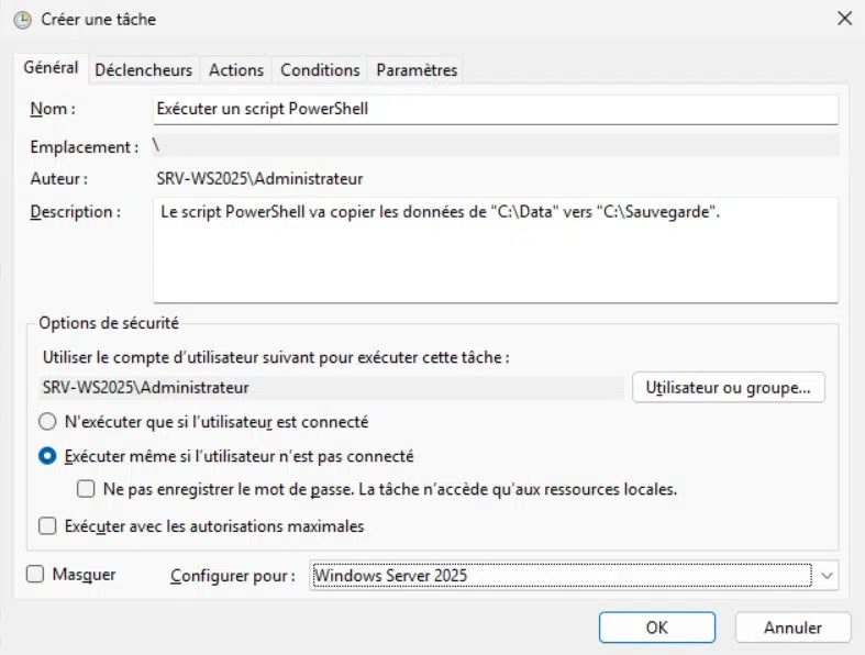 Vous devez sélectionner l’option « Exécuter même si l’utilisateur n’est pas connecté », sinon la tâche ne s’exécutera pas si la session de l’utilisateur n’est pas ouverte. De plus, sélectionnez « Windows Server 2025 » pour l’option « Configurer pour ». Cette option influence la manière dont la tâche est exécutée et quelles fonctionnalités sont disponibles, en fonction du système d’exploitation cible.