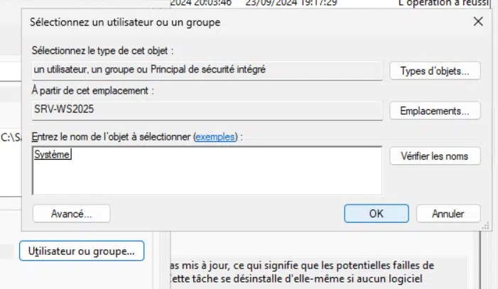 Pour exécuter la tâche avec un compte différent, cliquez sur le bouton « Utilisateur ou groupe ». Pour une tâche d’administration locale, le compte « Système » peut être utilisé. Assurez-vous que le champ « À partir de cet emplacement » soit égal au serveur local (sinon, cliquez sur « Emplacements… »), puis recherchez le compte « Système ».
