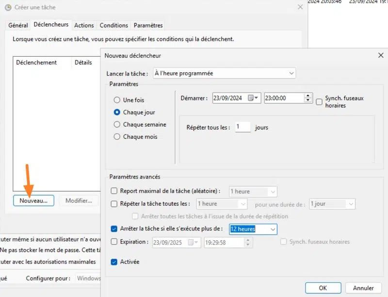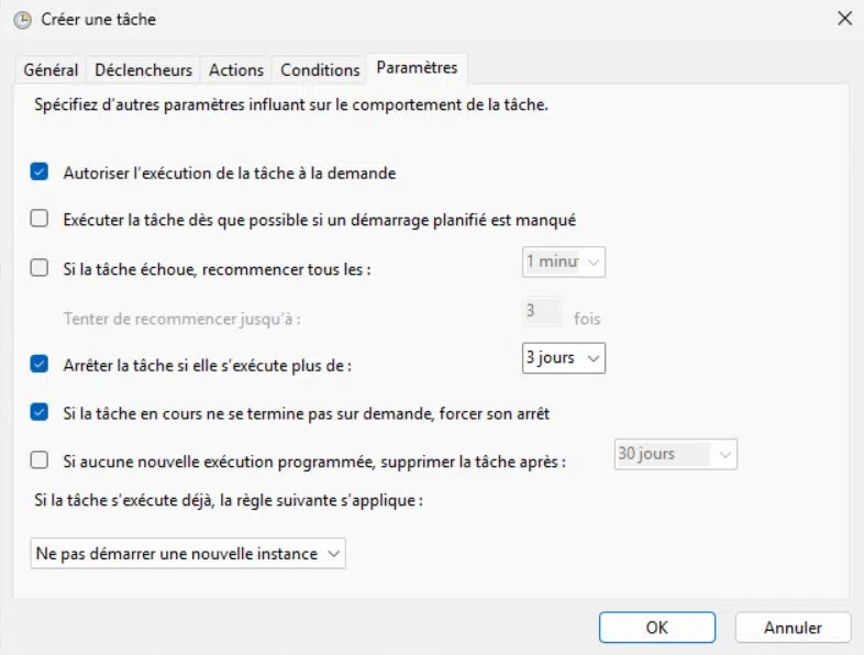 Vous pouvez aussi cocher l’option « Arrêter la tâche si elle s’exécute plus de : » afin d’arrêter la tâche automatiquement au bout d’un laps de temps, si elle n’a pas encore terminé. Ceci peut être utile pour s’assurer que la durée d’exécution d’une tâche n’excédera pas une durée spécifique. En complément, ce sera judicieux de chercher à comprendre pourquoi cette tâche s’est figée.