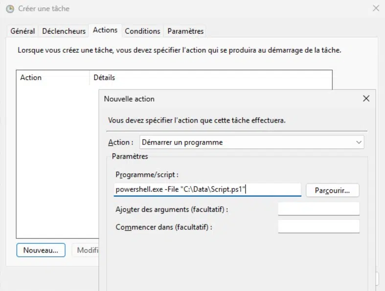 Basculez sur l’onglet « Actions » afin de créer une nouvelle action permettant d’exécuter notre script PowerShell. Choisissez « Démarrer un programme » comme type d’action et indiquez ceci comme « Programme/script » :