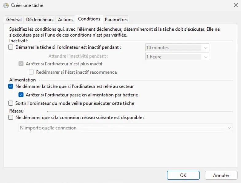 Par exemple, vous pouvez configurer la tâche pour qu’elle s’exécute uniquement si la machine est connectée à un réseau spécifique.