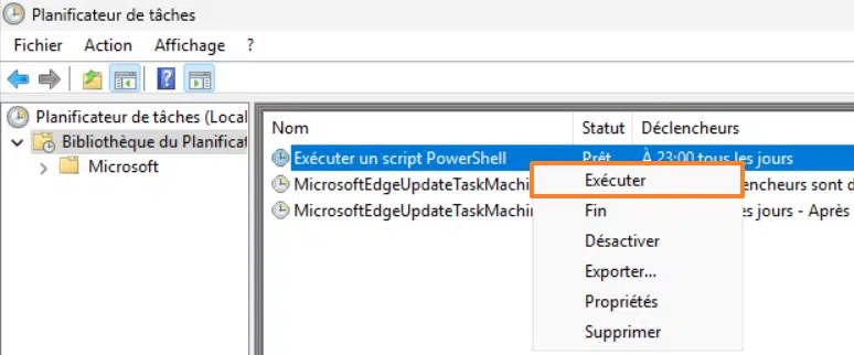 Validez avec « OK » pour créer la tâche. Afin de la tester dès maintenant, effectuez un clic droit sur son nom et cliquez sur « Exécuter ». Elle va passer sur le statut « En cours ».