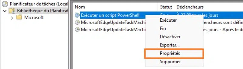 Pour modifier une tâche planifiée, il vous suffit d’effectuer un clic droit sur la tâche planifiée puis de cliquer sur « Propriétés ». Vous pouvez modifier toutes les options de la tâche planifiée, sauf le nom.