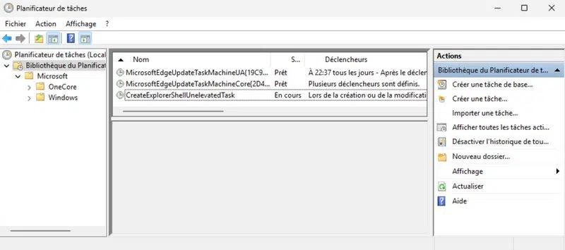 L’exemple ci-dessous montre la présence de 3 tâches dont 2 tâches destinées à maintenir à jour le navigateur Microsoft Edge sur la machine locale. La partie de gauche permet de naviguer dans les « dossiers » de la bibliothèque de tâches.