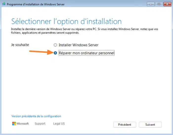 Lors du démarrage sur un support d’installation, vous devez choisir l’option « Réparer mon ordinateur personnel » avant de continuer.