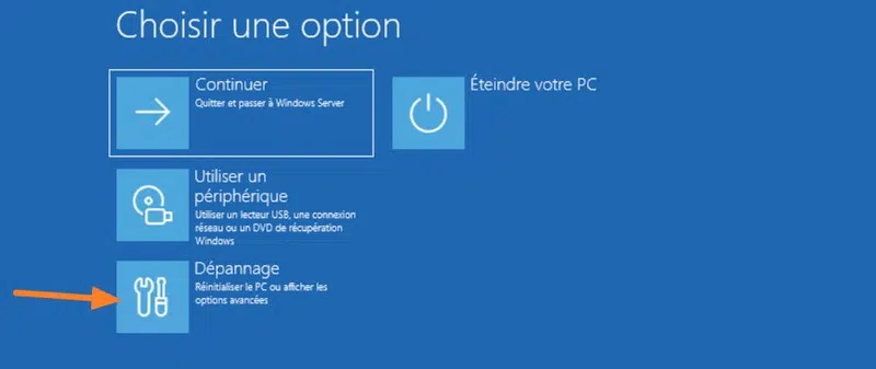 L’objectif étant de démarrer en mode de récupération. Si le serveur ne parvient pas à démarrer, il est fort probable qu’il bascule dans ce mode. Sinon, vous pouvez démarrer sur une image ISO ou une clé USB bootable de Windows Server pour accéder à cet environnement.