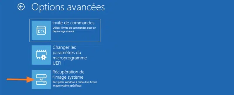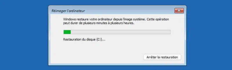 Un assistant va s’afficher à l’écran. Par défaut, l’outil va vous proposer de restaurer l’image la plus récente. Si vous souhaitez restaurer une autre image ou charger une image à partir d’un partage distant, vous devez choisir l’option « Sélectionner une image système ».