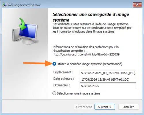Ensuite, cliquez sur « Récupération de l’image système » puis sélectionnez le système. En principe, une entrée nommée « Windows Server » doit être visible à l’écran.