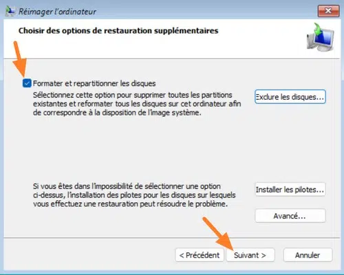 A l’étape suivante, cochez l’option « Formater et repartitionner les disques » pour que le serveur soit restauré intégralement et qu’il soit identique à l’image système qui sera restauré. Vous pouvez aussi « Exclure les disques » si vous souhaitez ne pas altérer un disque spécifique (celui utilisé par une application, par exemple).
