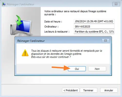 Il ne reste plus qu’à lancer la tâche de restauration. Après avoir cliqué sur « Terminer », une fenêtre de confirmation apparaîtra à l’écran. Cliquez sur « Oui ».