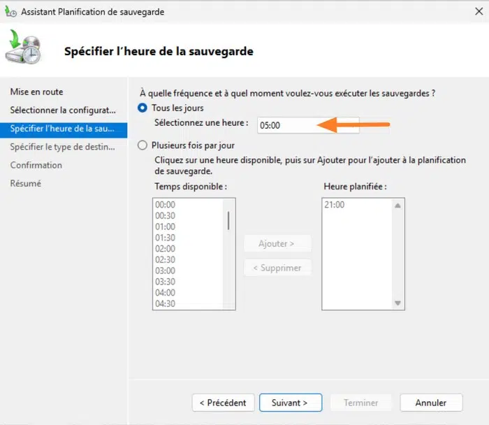 À l’étape suivante, vous devez spécifier l’heure et la fréquence à laquelle doit s’exécuter cette sauvegarde. Elle peut s’exécuter plusieurs fois par jour ou une seule fois par jour. Dans l’exemple ci-dessous, la sauvegarde est prévue pour « 05:00 » tous les jours.