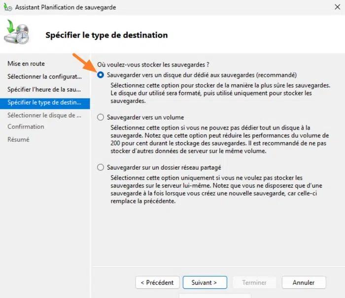 Puis sélectionnez « Sauvegarder vers un disque dur dédié aux sauvegardes » pour qu’un disque de la machine soit utilisé uniquement pour stocker les sauvegardes.