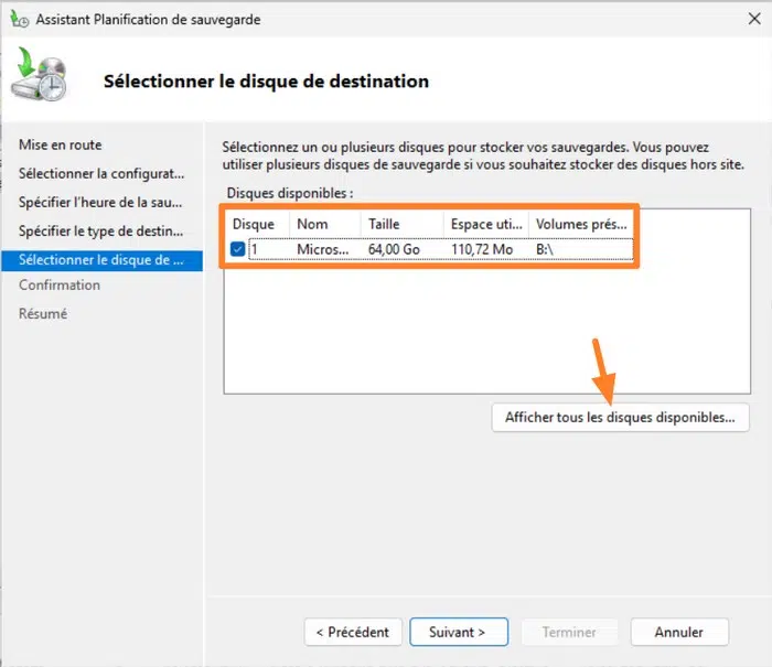 Vous devez ensuite sélectionner le disque sur lequel stocker les sauvegardes. Si la liste est vide, cliquez sur le bouton « Afficher tous les disques disponible ». Le disque n’a pas besoin d’avoir une lettre associée : si c’est le cas, ce n’est pas gênant, mais des messages d’avertissement seront affichés. Vous n’aurez qu’à valider.