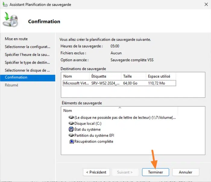 Vérifiez le résumé et validez pour créer la tâche de sauvegarde.