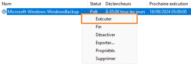 Ensuite, effectuez un clic droit sur la tâche planifiée et cliquez sur « Exécuter ». L’avancement pourra alors être suivi dans la console « Sauvegarde Windows Server ».