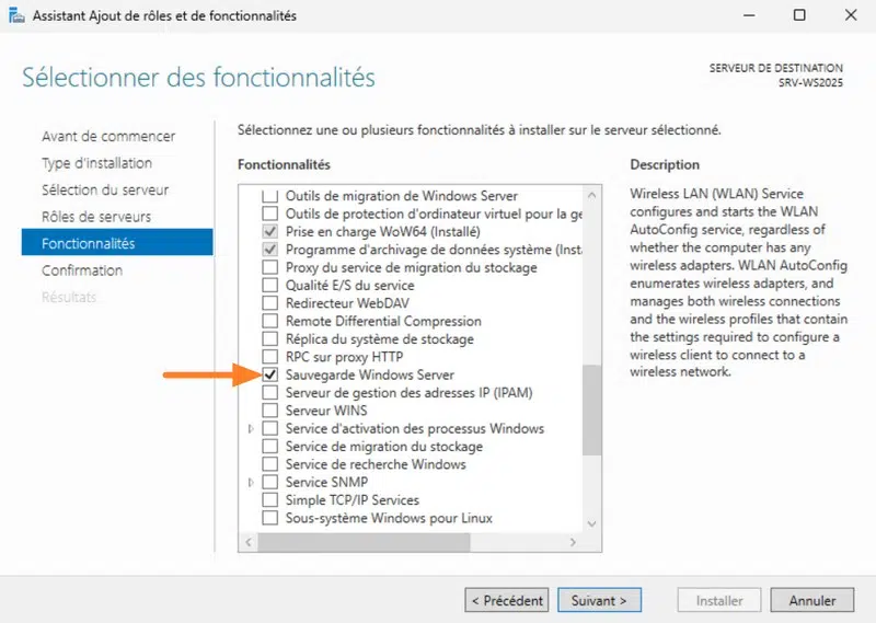 Pour installer la fonctionnalité « Sauvegarde Windows Server » sur Windows Server 2025 ou une version antérieure, suivez ces étapes :