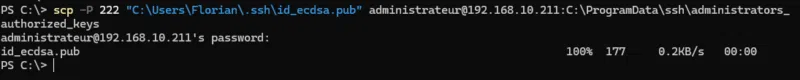 scp -P 222 "C:\Users\Florian\.ssh\id_ecdsa.pub" [email protected]:C:\ProgramData\ssh\administrators_authorized_keys
