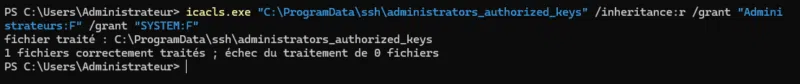 icacls.exe "C:\ProgramData\ssh\administrators_authorized_keys" /inheritance:r /grant "Administrateurs:F" /grant "SYSTEM:F"