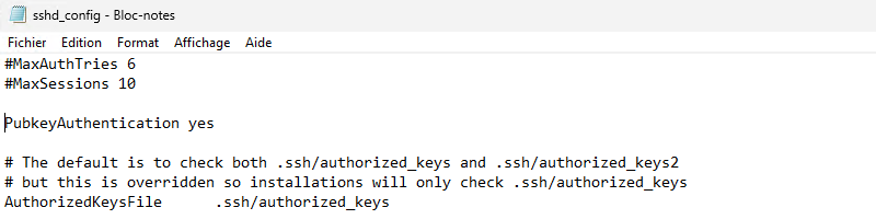 Par défaut, seule l’authentification par mot de passe est autorisée dans le serveur SSH de Windows. Nous devons éditer le fichier « sshd_config » pour activer l’authentification basée sur une clé.