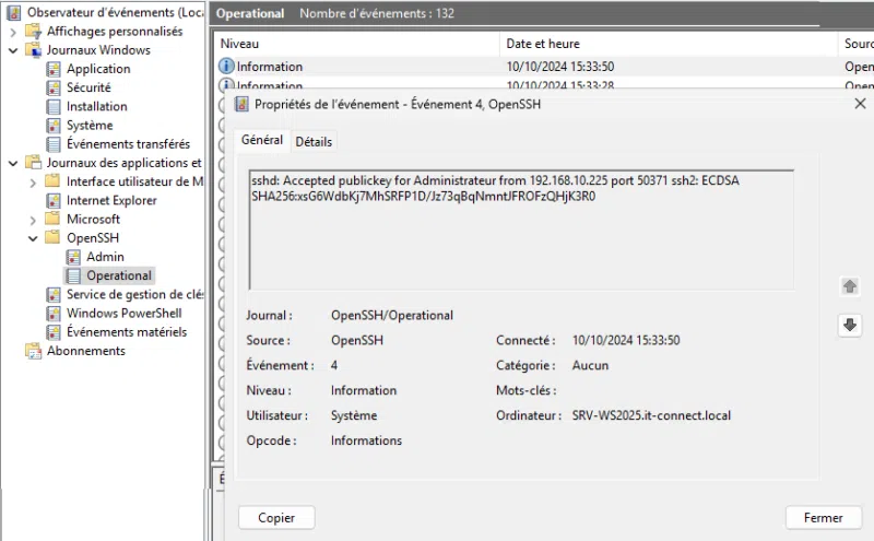 - Journaux des applications et des services > OpenSSH > Operational