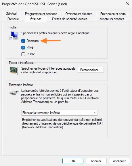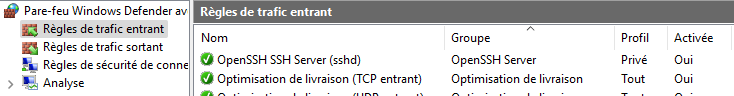 Cette règle autorise le flux entrant uniquement sur le profil « Privé » du pare-feu Windows Defender. Cela signifie que si la machine est connectée à un domaine Active Directory, il ne sera pas possible de se connecter en SSH.