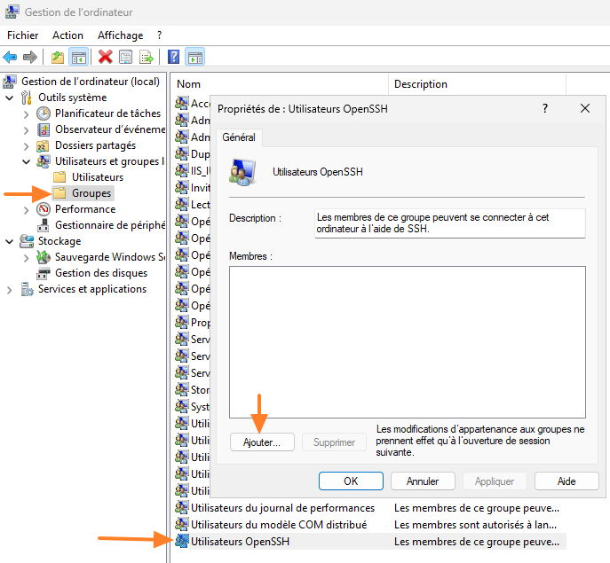 Néanmoins, si votre serveur est en français, vous devez adapter la configuration, car le groupe ne s’appelle pas « openssh users » mais « Utilisateurs OpenSSH ». Adaptez la ligne :