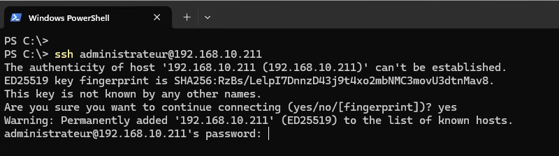 La première fois, il sera nécessaire de valider la tentative de connexion en écrivant « Yes » suivi d’un appui sur la touche « Entrée ». Ensuite, le mot de passe de l’utilisateur sera demandé.