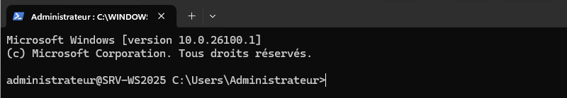 S’il est correct et que ce compte est autorisé à se connecter, la connexion sera établie et un shell s’affichera à l’écran. Ce shell contient un prompt constitué du nom du compte connecté, ici « administrateur@SRV-WS2025 » et de l’emplacement dans lequel on se situe sur la machine distante.
