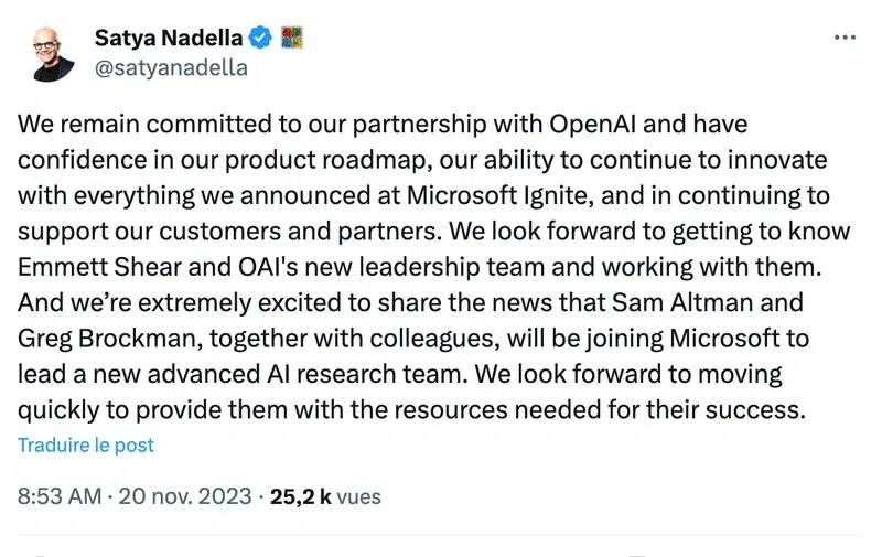 Il s'agit d'une information officielle puisque c'est Satya Nadella, le grand patron de Microsoft, qui l'a annoncé sur X (Twitter) en début de matinée. Microsoft va continuer à travailler en collaboration avec OpenAI : "Nous restons engagés dans notre partenariat avec OpenAI et avons confiance dans notre feuille de route, dans notre capacité à continuer à innover.", précise Satya Nadella dans son tweet.