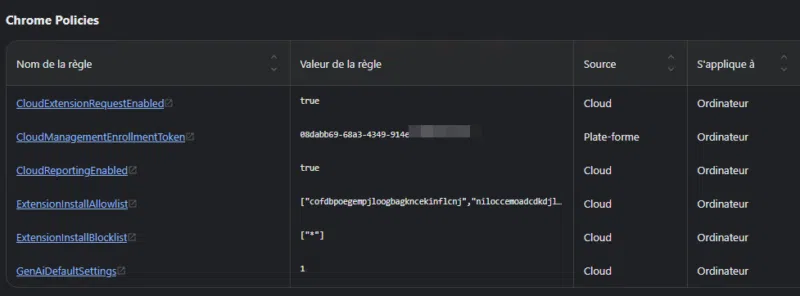 Cela offre une vue unifiée sur les paramètres appliqués depuis la console Cloud ou depuis une GPO.