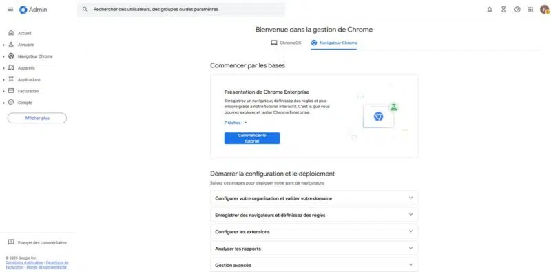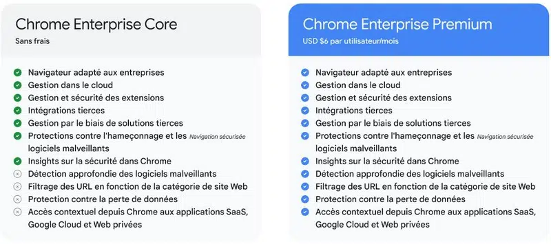 Google, avec sa plateforme Chrome Enterprise Core, offre la possibilité aux entreprises de gérer la configuration de Google Chrome et du Chrome Web Store de façon centralisée. Cela ne s'arrête pas là, puisqu'il y a également des capacités de gestion pour les appareils sous Chrome OS (Chromebook), mais il s'agit de fonctionnalités réservées à la version Enterprise Premium.