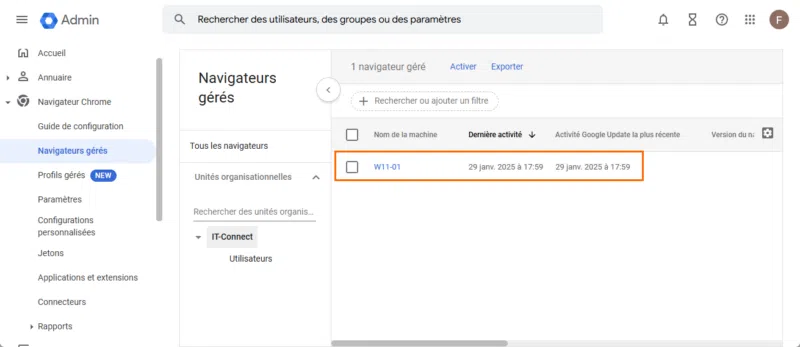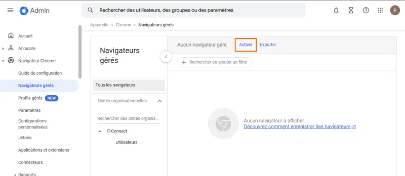 À partir de l'interface Admin, cliquez sur "Navigateur Chrome" puis sur "Navigateurs gérés". Ensuite, sur la droite, cliquez sur le bouton "Activer".