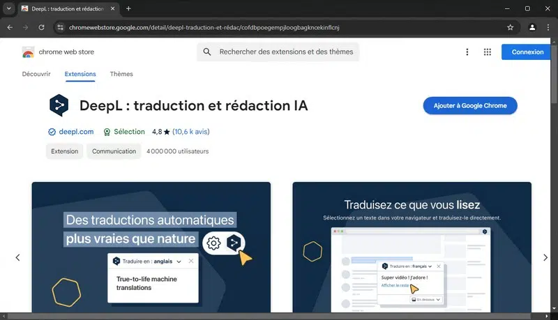 Sur le poste de travail où il y a le navigateur géré, l'extension DeepL peut être installée par l'utilisateur. Cette restriction s'applique que ce soit un utilisateur local ou Active Directory (ou autre) et qu'il soit administrateur ou non. De plus, la restriction s'applique même sans compte connecté dans le navigateur.