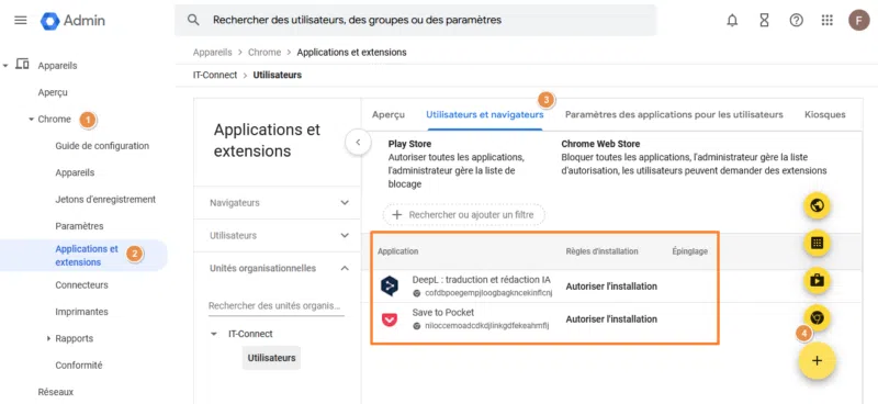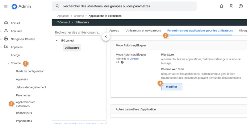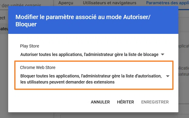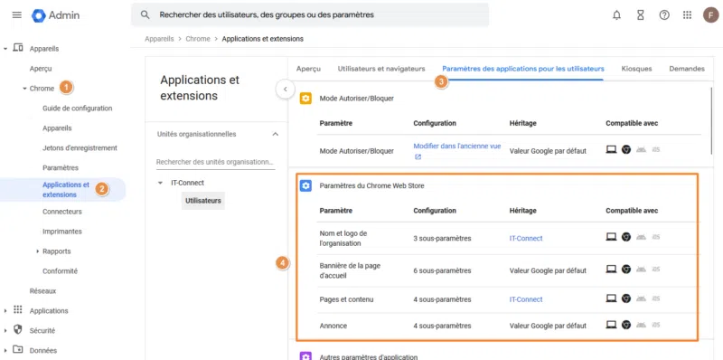 Ccliquez sur "Appareils", "Chrome" puis sur "Applications et extensions". Ensuite, dans la partie centrale, cliquez sur l'onglet "Paramètres des applications pour les utilisateurs". Ici, vous avez les paramètres du Chrome Web Store, que vous pouvez personnaliser.