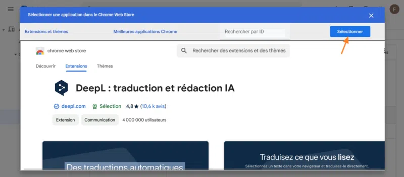 Vous devez donc rechercher l'extension à autoriser, par exemple, ici DeepL, puis cliquer sur le bouton "Sélectionner". Plusieurs options seront proposées, vous devez à minima autoriser l'installation.