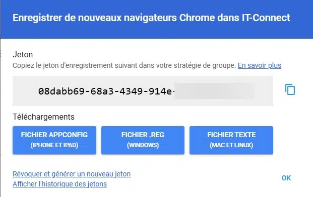 Un jeton va être généré. Vous devez le copier puisque nous allons voir comment le déployer par GPO. Vous avez aussi la possibilité de cliquer sur le bouton "FICHIER .REG" pour télécharger un fichier de Registre à importer sur une ou plusieurs machines. Un même jeton est utilisable par un ensemble d'installations.