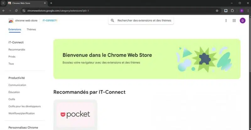 Ce qui va particulièrement m'intéresser pour cette démonstration, c'est la personnalisation du Chrome Web Store. Il s'agit de la plateforme de Google où sont référencées les extensions, y compris les extensions malveillantes qui parviennent à s'y faire une place de temps en temps....