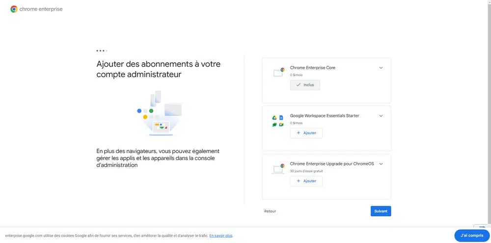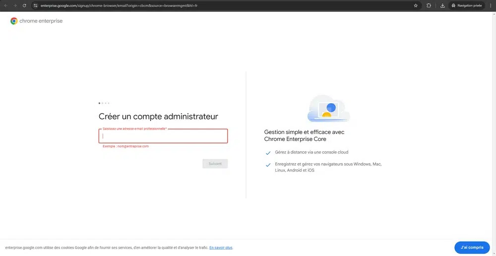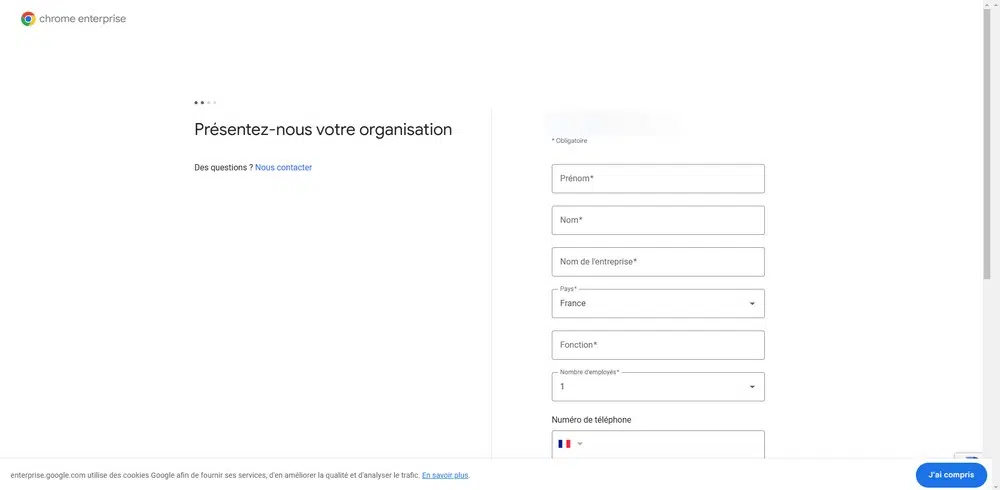 La première chose à faire, si cela vous intéresse, c'est de créer un compte au nom d'une organisation pour accéder à Chrome Enterprise Core. Autrement dit, il faut créer un compte Administrateur (qui deviendra un compte Google) et renseigner quelques informations sur la société utilisatrice.