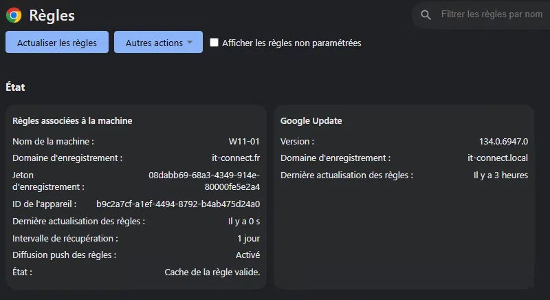 Pour visualiser les stratégies appliquées ou effectuer un refresh, vous pouvez ouvrir le navigateur Chrome sur la machine et accéder à cette adresse :