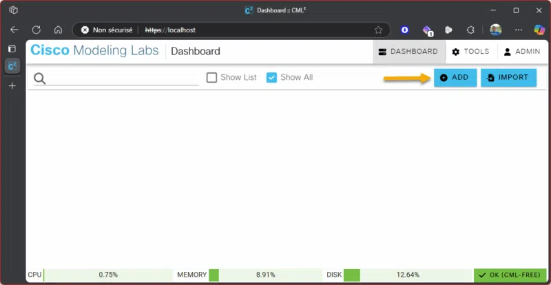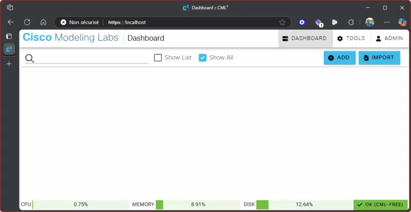 Pour commencer, nous devons nous connecter à l’interface de CML à l’adresse suivante : https://<adresse-IP-CML> (ou nom d'hôte).