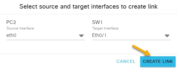 Maintenant que nous avons nos équipements, nous allons devoir les relier entre eux. Pour cela, nous devons faire un clic droit sur un équipement et sélectionner l’option Add Link, puis sélectionner le second équipement, puis sélectionner CREATE LINK. Un lien sera alors créé entre les deux équipements.