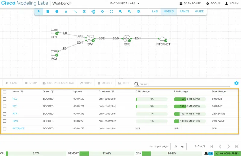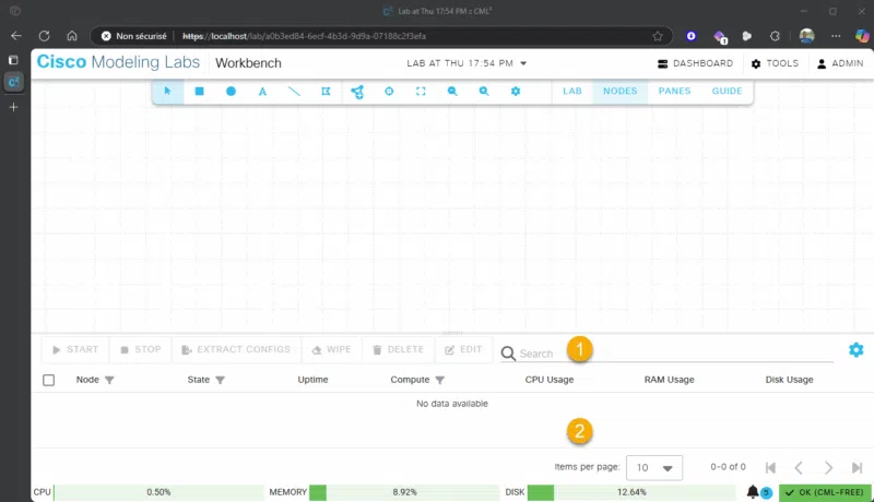 Si nous cliquons sur NODES, nous avons les informations complètes du laboratoire.