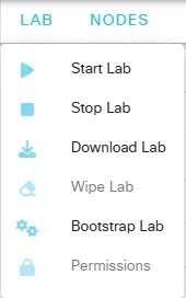 Comment lancer les équipements du laboratoire ? Rien de plus simple, nous devons aller dans le menu LAB et cliquer sur START LAB. Le démarrage est ordonnancé, tous les équipements sont des machines virtuelles KVM. Les icônes représentent leur état :