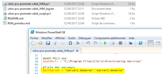 Dans un premier temps il est nécessaire de modifier le script citrix-pvs-promote-vdisk_IHM.ps1 à la ligne 42 afin d'ajouter la liste du serveur PVS :