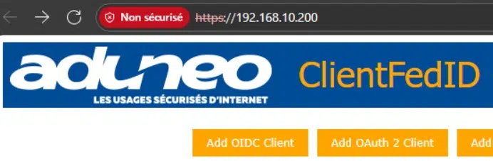 Dès à présent, vous devriez pouvoir accéder à l'interface de ClientFedID, via l'adresse IP de votre hôte Docker (en HTTPS).