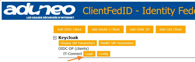 La page d'accueil de ClientFedID contient désormais un IdP nommé Keycloak associé à un premier client correspondant à celui que nous venons de configurer. L'outil ClientFedID est capable de gérer plusieurs configurations, ce qui est plutôt avantageux pour évaluer différents scénarios.